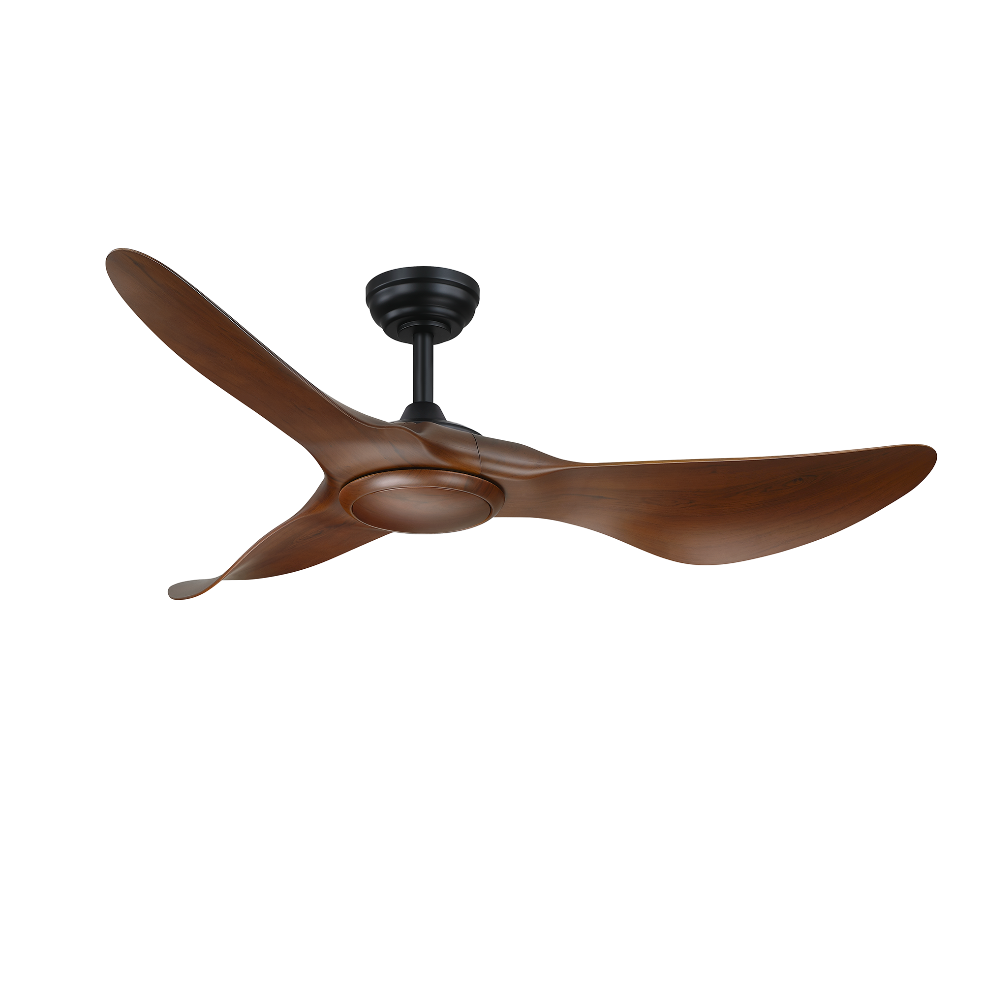 TEMPEST 52 in. 3 Blade DC Motor Ceiling Fan with Adjustable Color LED Light Kit in a Black finish with Dark Walnut blades. The included Full-function Remote Control provides 6 Speeds, CCT (LED Color) Adjustability, LED Dimmer, Reverse Function, 1/4/8 Hour Timer to shut Fan off Automatically, and a Variable Wind feature which modulates Fan Speed to simulate a Natural Breeze.